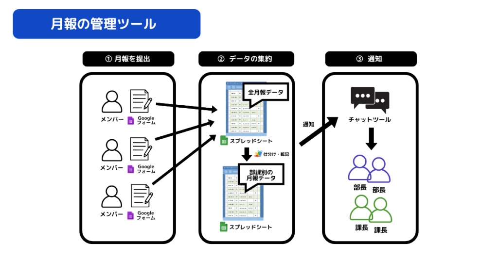 - 各メンバーがGoogleフォームで月報を提出